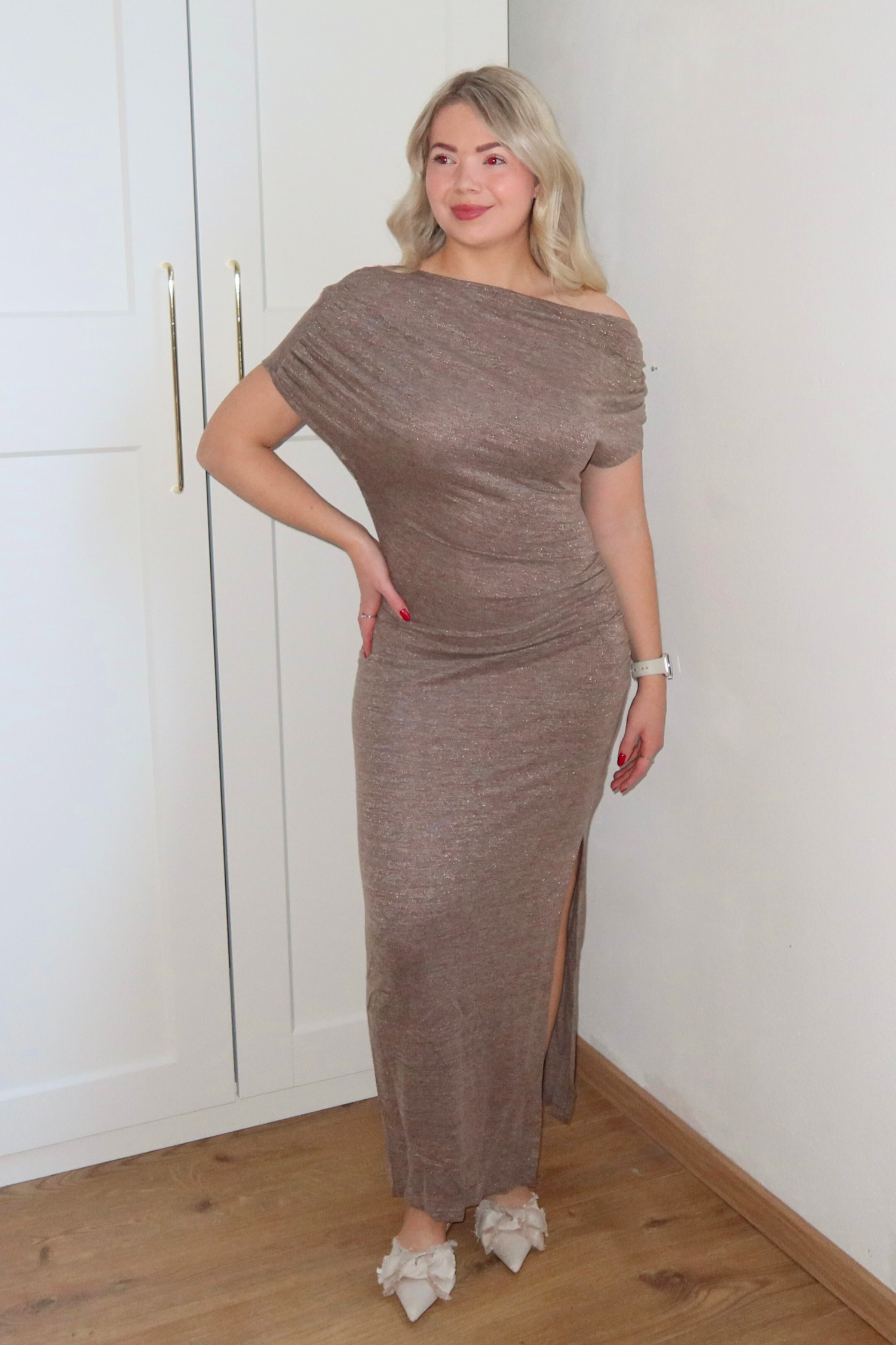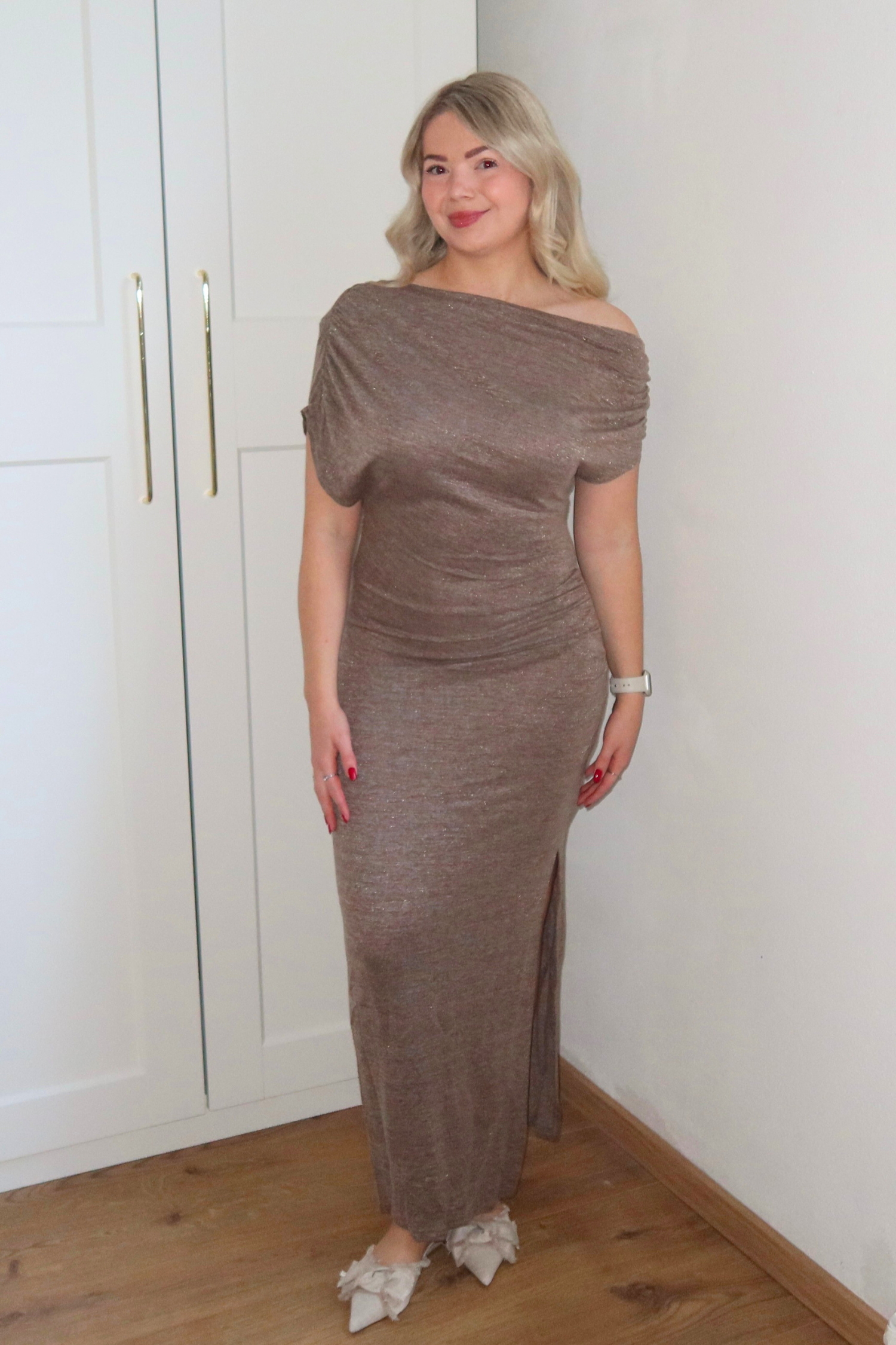 De TESS jurk is een elegante maxi-jurk met een zachte, gedrappeerde off shoulder halslijn. De glitterstof geeft de jurk een... Lees meer